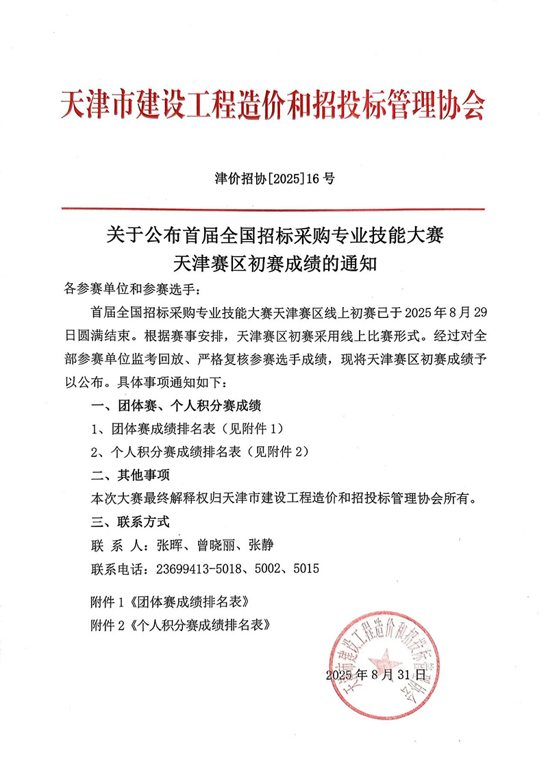近日,由天津市建設工程造價和招投標管理協(xié)會舉辦的首屆全國招標采購專業(yè)技能大賽天津賽區(qū)比賽圓滿落幕。此次天津賽區(qū)匯聚了全市25家優(yōu)秀企業(yè)和140名行業(yè)精英同臺競技,天津咨詢所屬泛亞咨詢在激烈競爭中脫穎而出,斬獲團體賽桂冠,武宇哲、石恩婧、張典等3名員工成功躋身全市個人積分賽排名前十,充分彰顯了泛亞咨詢在招標采購領域的專業(yè)實力與人才優(yōu)勢。