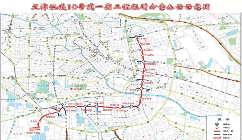 天津地鐵10號(hào)線為城區(qū)西南至東北方向的軌道交通骨干線,南起西青區(qū)梨園頭,最終進(jìn)入北部新城地區(qū),全長43.2公里。地鐵10號(hào)線南段工程由梨園頭至嶼東城,從衛(wèi)國道途經(jīng)沙柳路、天鋼柳林、珠江道、麗江道、梅江至梨園頭車輛段,線路全長約21公里,其中地下線20.3公里,過渡線及地面線0.7公里,共設(shè)21座車站(20個(gè)地下站,1個(gè)地面站),設(shè)梨園頭車輛段,與地鐵1、2、4、5、6號(hào)線換乘。