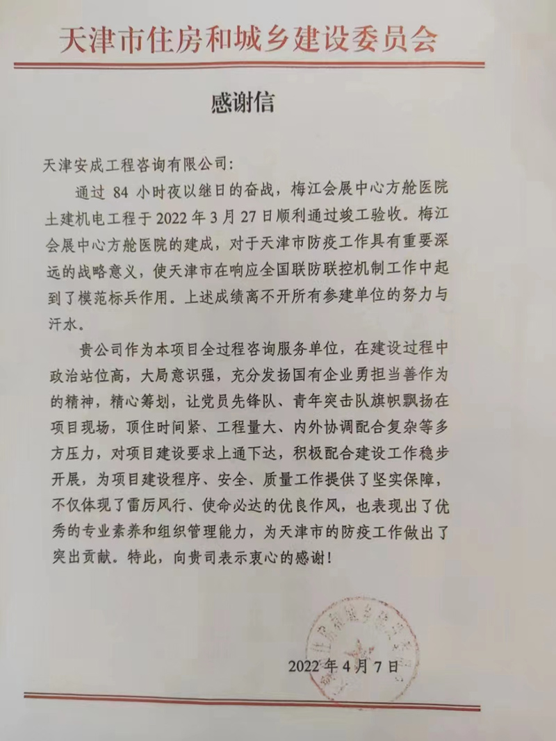 經(jīng)過84小時夜以繼日的奮戰(zhàn),梅江會展中心土建機電工程于2022年3月27日順利通過竣工驗收。4月7日,天津市住房和城鄉(xiāng)建設委員會向安成公司發(fā)來感謝信,對安成公司在項目建設過程中體現(xiàn)出的雷厲風行、使命必達的優(yōu)良作風以及優(yōu)秀的專業(yè)素養(yǎng)和組織管理能力給予了高度認可。