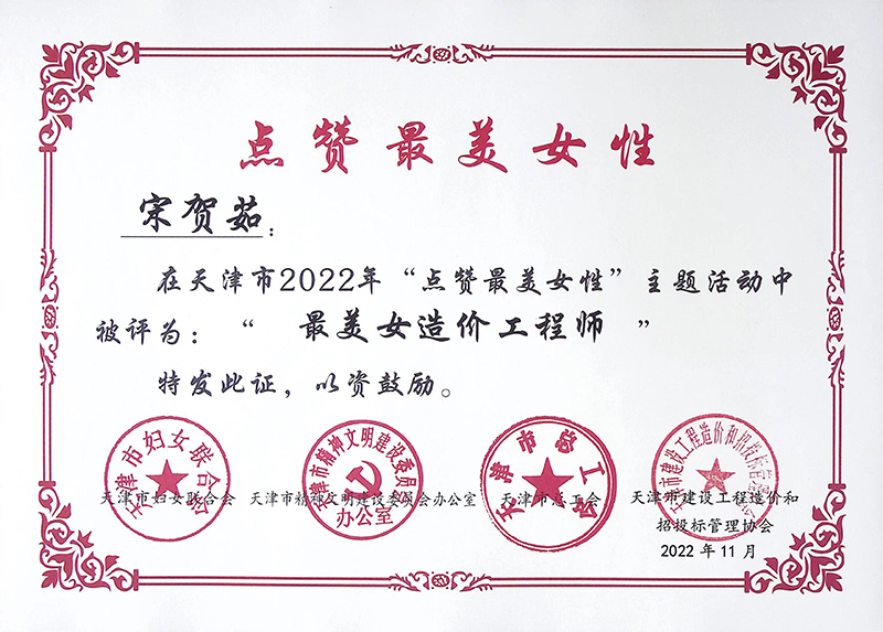 在“三八”國際勞動婦女節(jié)到來之際,從天津市泛亞工程咨詢有限公司傳來喜訊:在市婦聯(lián)、市文明辦、市總工會、津價招協(xié)聯(lián)合開展的天津市2022年“點贊最美女性”主題活動中,泛亞公司造價三部部門經(jīng)理宋賀茹榮獲“最美女造價工程師”稱號。