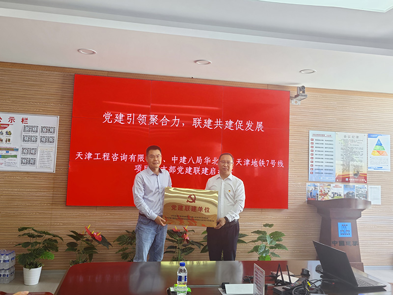 5月20日,為進一步加強天津地鐵七號線參建單位之間的深入交流合作,有力發(fā)揮黨組織引領(lǐng)凝聚作用,搭建常態(tài)化的溝通交流平臺,推動項目健康、快速、高質(zhì)量發(fā)展,打造優(yōu)質(zhì)地鐵工程,在深入開展中央八項規(guī)定精神學習教育之際,天津咨詢第三事業(yè)部黨支部與中建八局華北分公司六里臺站黨支部開展了主題黨日暨黨建聯(lián)建共建活動。天津咨詢公司黨委委員、副總經(jīng)理鐘海榮、中國建筑第八工程局有限公司華北分公司基礎(chǔ)設(shè)施分公司黨總支副書記、執(zhí)行總經(jīng)理龐衛(wèi)濤等出席活動并揭牌。
