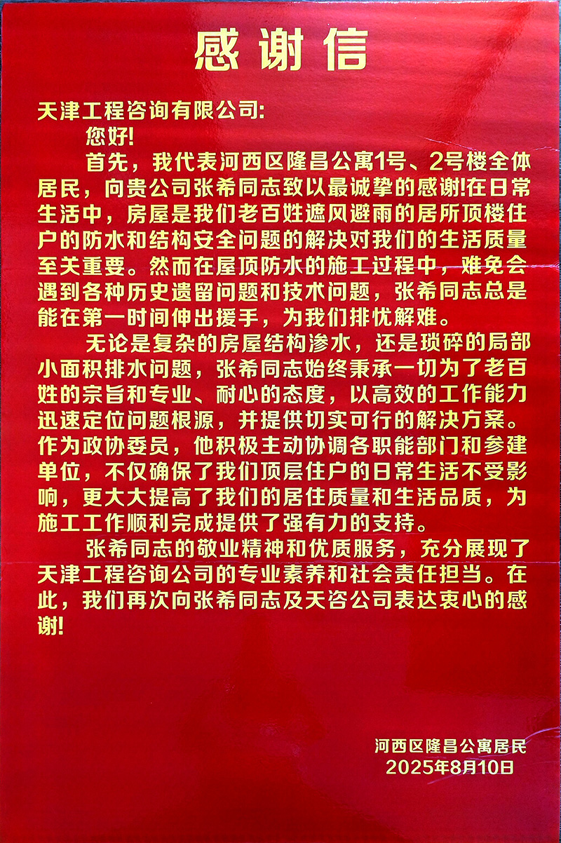 為有效促進(jìn)工程進(jìn)展,項(xiàng)目團(tuán)隊(duì)主動(dòng)加強(qiáng)與居民、街道和社區(qū)的多層次溝通。在各小區(qū)設(shè)立聯(lián)絡(luò)點(diǎn),及時(shí)公開(kāi)施工與監(jiān)理信息,迅速響應(yīng)居民關(guān)切。如隆昌公寓屋面滲水問(wèn)題,團(tuán)隊(duì)僅用三天便協(xié)調(diào)解決,展現(xiàn)出高效務(wù)實(shí)的作風(fēng)。施工前主動(dòng)告知計(jì)劃,協(xié)助居民做好防護(hù),合理安排作業(yè)時(shí)間避開(kāi)休息時(shí)段,還為年長(zhǎng)體弱居民提供搬運(yùn)幫助。這些細(xì)致入微的服務(wù)贏得了居民的廣泛贊譽(yù),特地送來(lái)感謝信,表?yè)P(yáng)團(tuán)隊(duì)“專(zhuān)業(yè)、耐心、高效”。