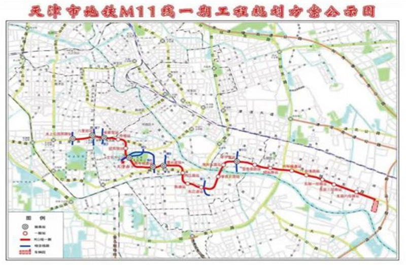 天津地鐵11號線一期工程線路全長22.6公里,共設(shè)21座車站,均為地下站。在東麗區(qū)設(shè)置七經(jīng)路定修段一座。本工程設(shè)有兩座主變電所,新建六里臺主所1座與7號線共享,新建馴海路主所1座,與Z1線共享,正線設(shè)置牽引變電所11座,定修段獨立設(shè)置 1座牽引變電所??刂浦行囊惶帲O(shè)置在華苑車輛段內(nèi),另外在七經(jīng)路定修段設(shè)備用控制中心一處。概算總投資256.02億元。
