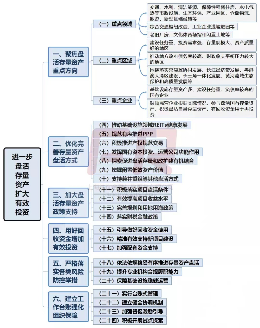 剛剛,國(guó)務(wù)院辦公廳發(fā)布《關(guān)于進(jìn)一步盤(pán)活存量資產(chǎn)擴(kuò)大有效投資的意見(jiàn)》(國(guó)辦發(fā)〔2022〕19號(hào))。新規(guī)共提出24條意見(jiàn),整體框架如下: